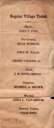In 1867 the Village of Brooklyn was incorporated. John Fish served in various capacities as a village official. The first year he was one of the trustees. From 1869 through 1871, John Stanton Fish served as the treasurer. After a brief hiatus from the political scene, John Stanton Fish ran for the office of Mayor. He served in this capacity for two years, 1878 and 1879.[5]